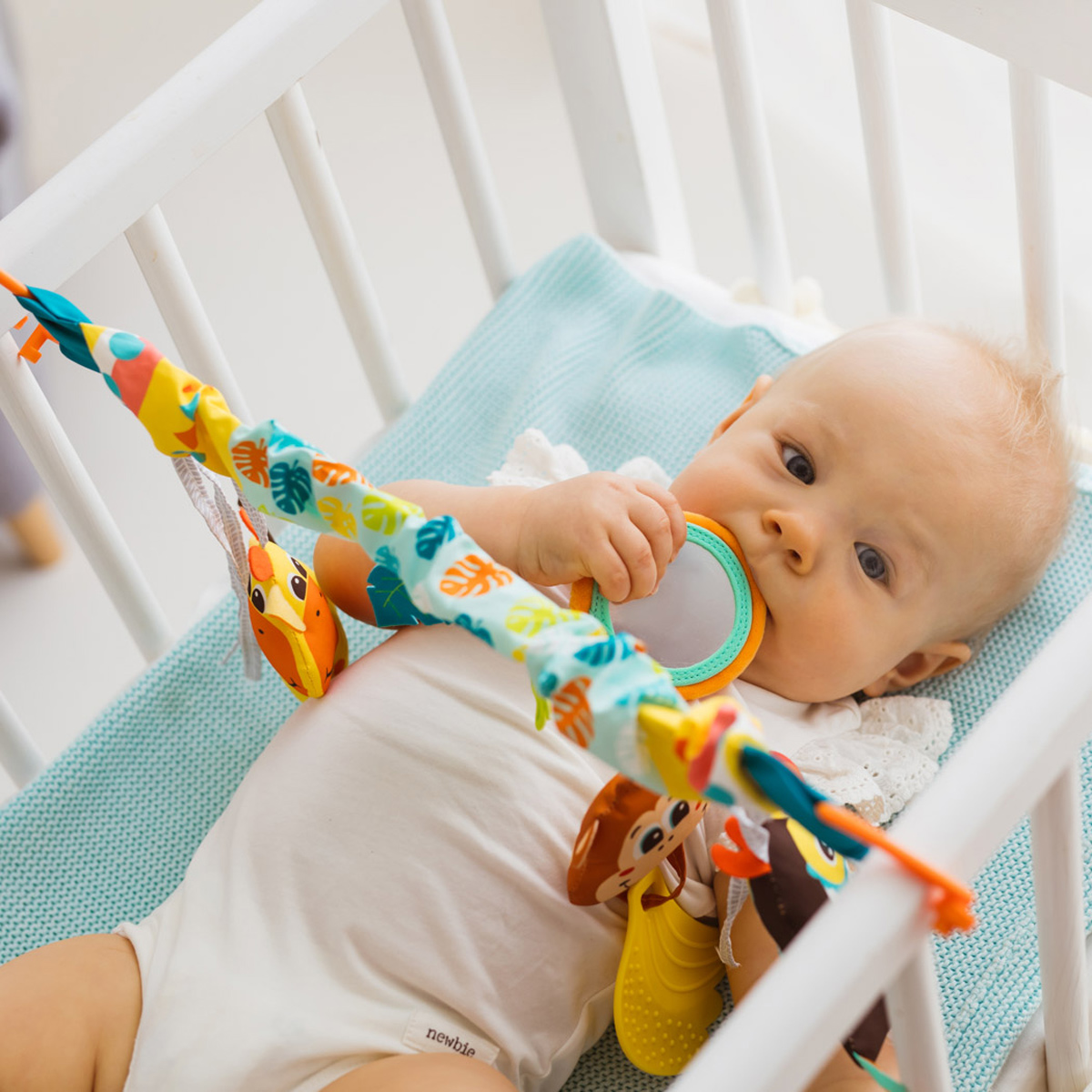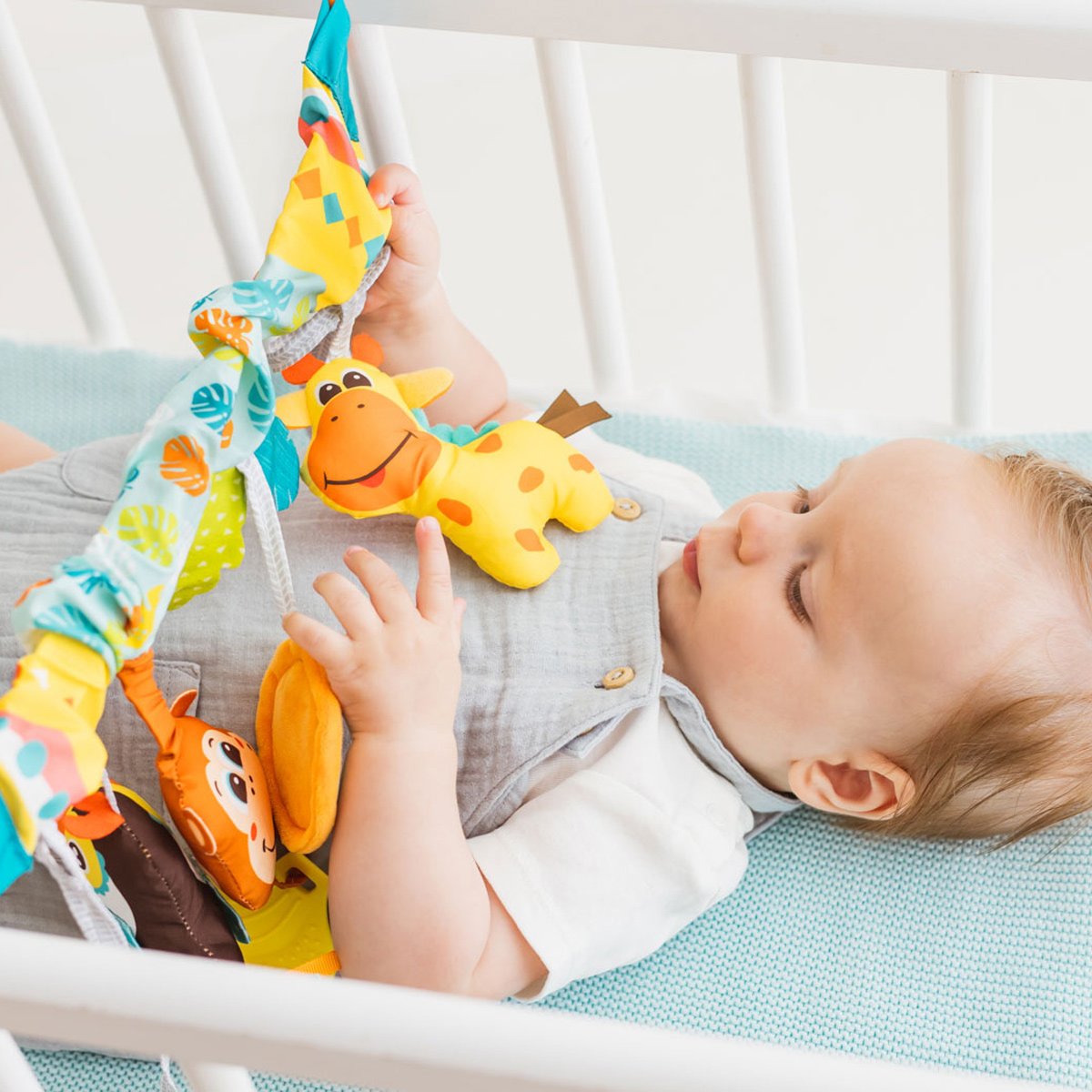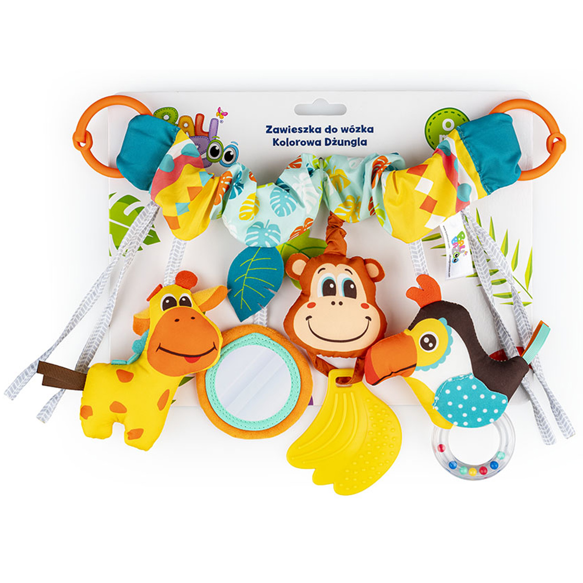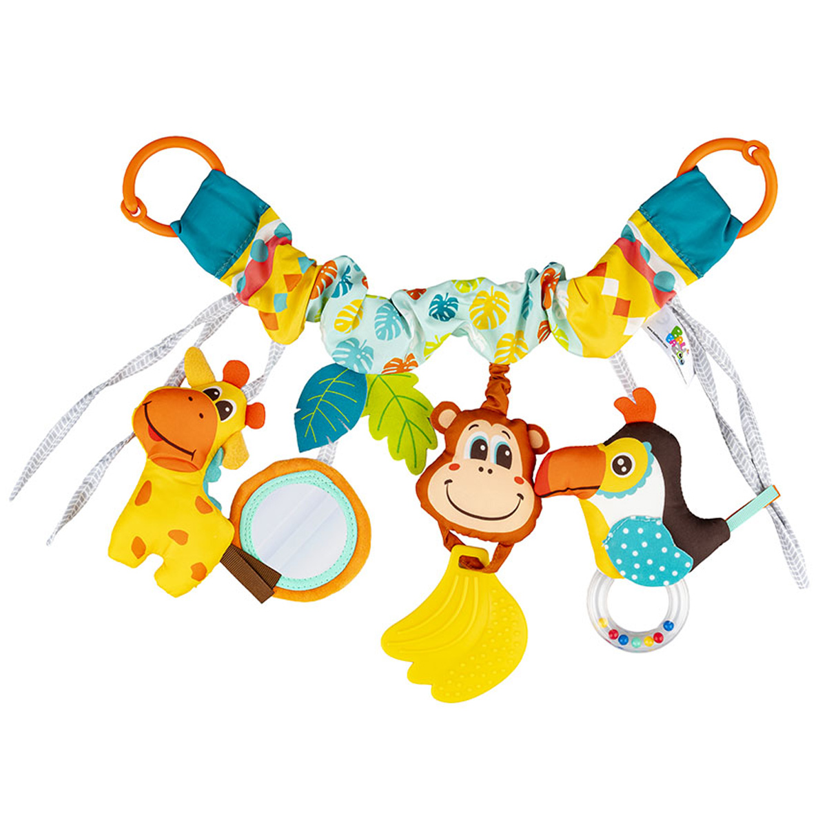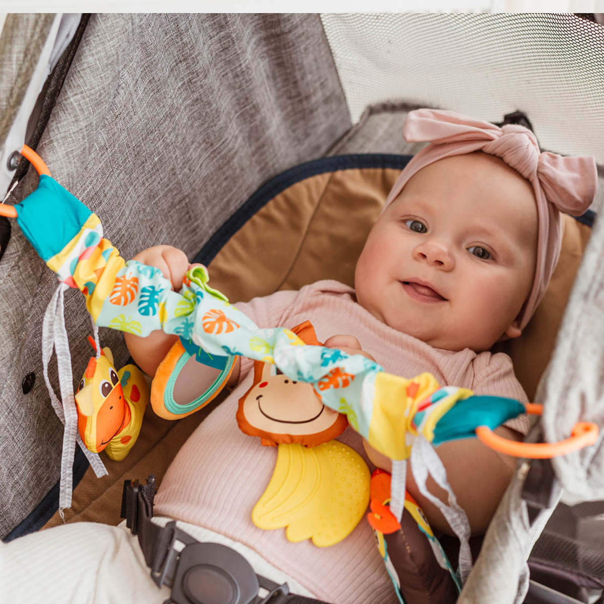 Egzotyczna zawieszka wypełniona sensorycznymi niespodziankami to pomysł na wesołą zabawę w poznawanie świata za pomocą zmysłów! Zawieszka wykonana jest z materiałów o zróżnicowanych fakturach, a elastyczna taśma, do której przyszyte są zabawki, rozciąga się, co ułatwia przymocowanie zawieszki w wybranym miejscu. Ponadto znajdziemy tu dwa rodzaje mocowań – zapinane kółeczka oraz wiązane tasiemki. Taśmę zdobi bezpieczne lustereczko, służące do samopoznania bobasa, miękki gryzaczek w kształcie kiści bananów, dzwoneczek w kształcie żyrafy i grzechoczące kółeczko przymocowane do materiałowego tukana. Produkt przeznaczony jest dla dzieci od dnia narodzin.