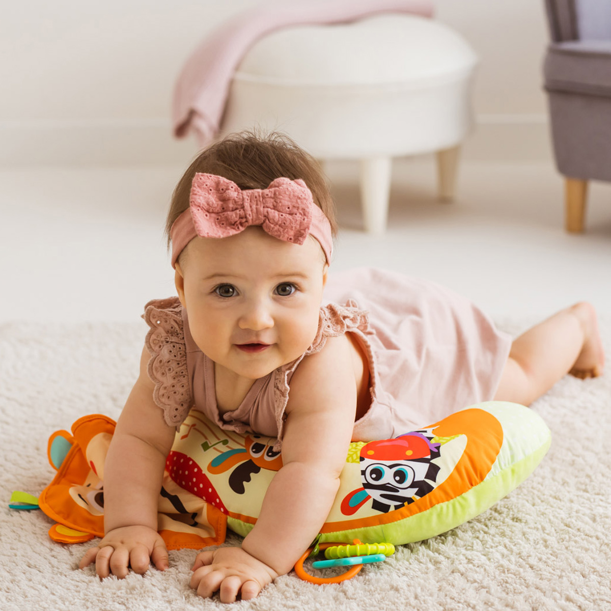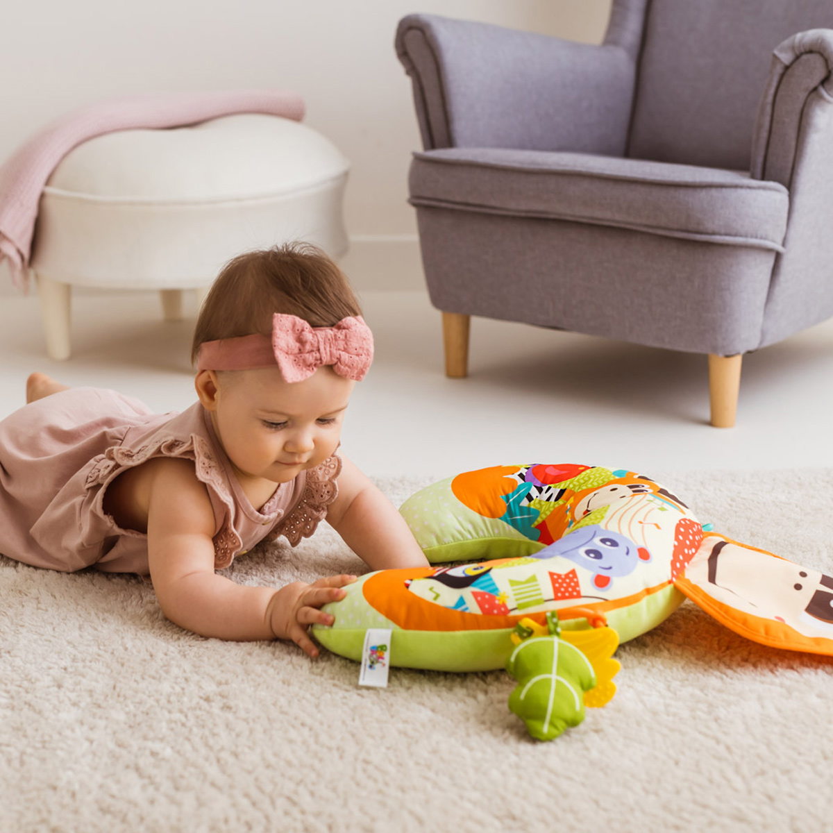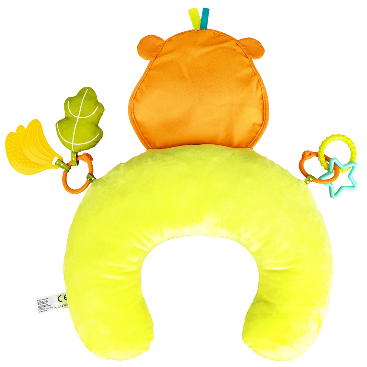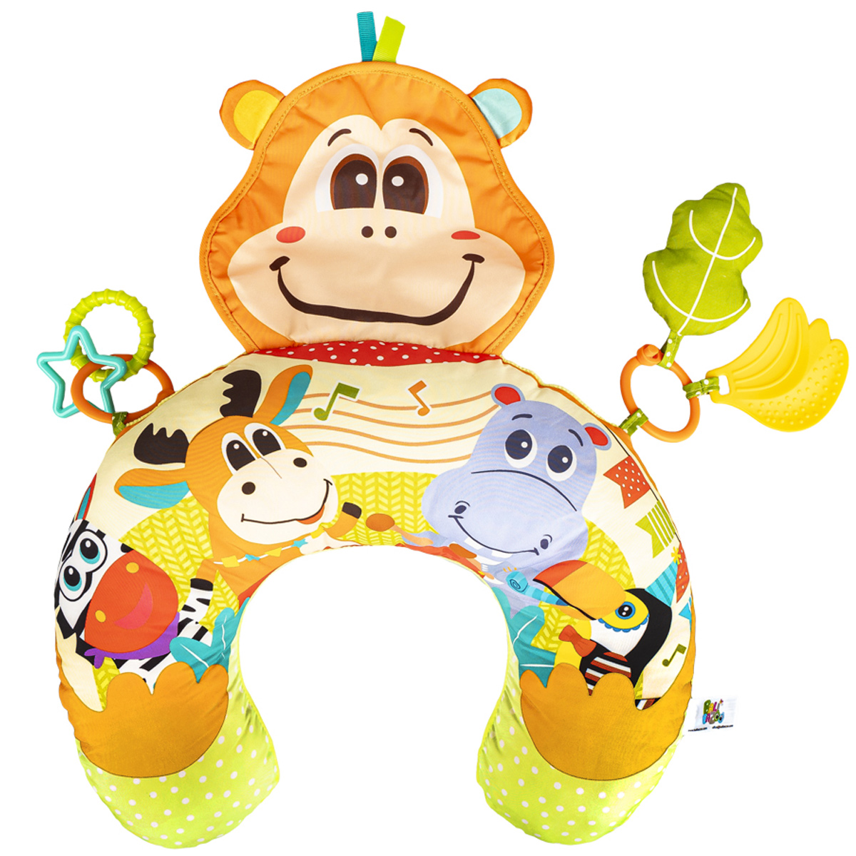 Kolorowa podusia zapewni wsparcie maluszkowi leżącemu na brzuchu i zabawi go wesołymi obrazkami zwierzaczków! Poduszka wykonana została z materiałów różniących się kolorem, nadrukiem, a także fakturą, co pozwoli rozwijać zdolności poznawcze dziecka. Doszyta małpia głowa zabawnie szeleści przy dotykaniu, a przymocowane do poduszki zabawki zapewnią małym rączkom dodatkowe zajęcie. Na jednym z odczepianych kółeczek znajdziemy twarde kształty, a na drugim – piszczałkę w kształcie listka i miękki gryzak w kształcie kiści bananów. Produkt przeznaczony jest dla dzieci od dnia narodzin.